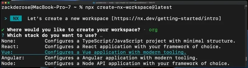 The first place your might notice Nx’s support for Vue is in the create-nx-workspace script: